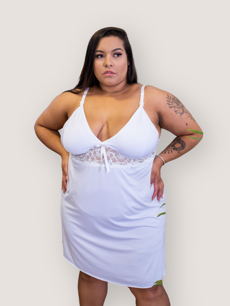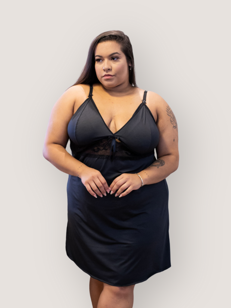 A Camisola Amamentação Plus Size Bruna é produzida com tecido de alta qualidade e possui detalhe em renda. Alças possuem regulagem e possui um fecho com click para facilitar a amamentação.
