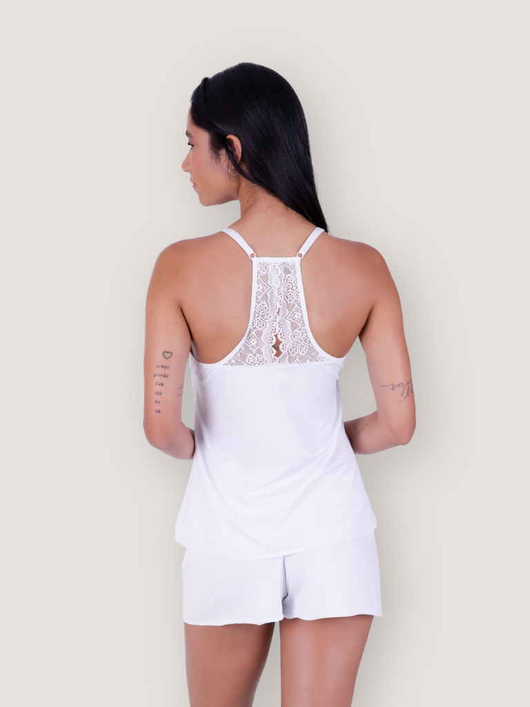 Possui alças ajustáveis e é confeccionada em microfibra light e com detalhes em renda.